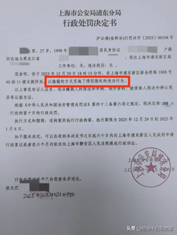 浦东分局《行政处罚决定书》显示,该男子"偷窥侵犯女性隐私",警方作出行政拘留10日的处罚,这已是针对此类行为的顶格处理。