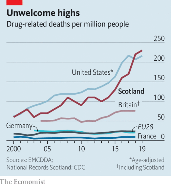 美国、苏格兰地区(深红)、英国整体(浅红)及其他欧洲国家每百万人当中死于滥用药物的人数 图自:《经济学人》