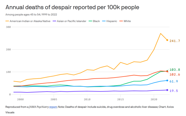 1999年至2022年,45至54岁的美国人每10万人中报告的死于绝望人数,橙、紫、绿、蓝、红线分别代表印第安或阿拉斯加原住民、亚裔或太平洋岛民、非裔、西班牙裔、白人