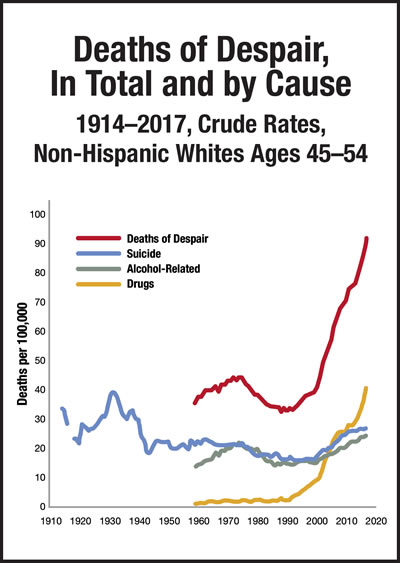 比如美国诺贝尔经济学奖获得者安格斯·迪顿和他老婆安妮·凯斯在2019年的时候写了本著名的书,《绝望的死亡与资本主义的未来》(Deaths of Despair and the Future of Capitalism)。书里他们提出了一个美国人至今仍在使用的概念,叫做"绝望的死亡"。意思是美国人,特别是美国中年白人,并非美国社会经济上最底层的那些人,因毒品、酒精、自杀等原因而死亡的案例在近些年不正常地飙升,而这些死亡往往来自于社会或心理上的绝望。