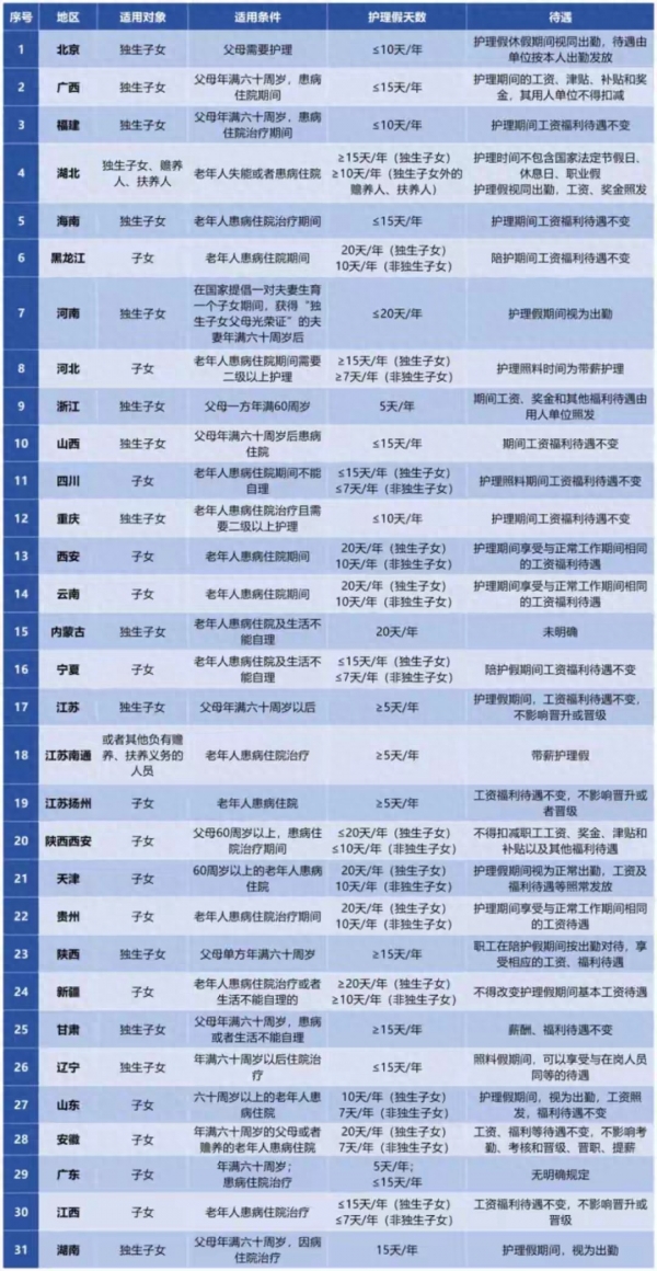 福建、广州、重庆、四川这些地方确实出了独生子女护理假。家里老人生病住院,你能申请10到20天带薪假陪着。好比武汉就明确说了,60岁以上老人患病住院,子女拿着医院证明就能跟单位提申请。