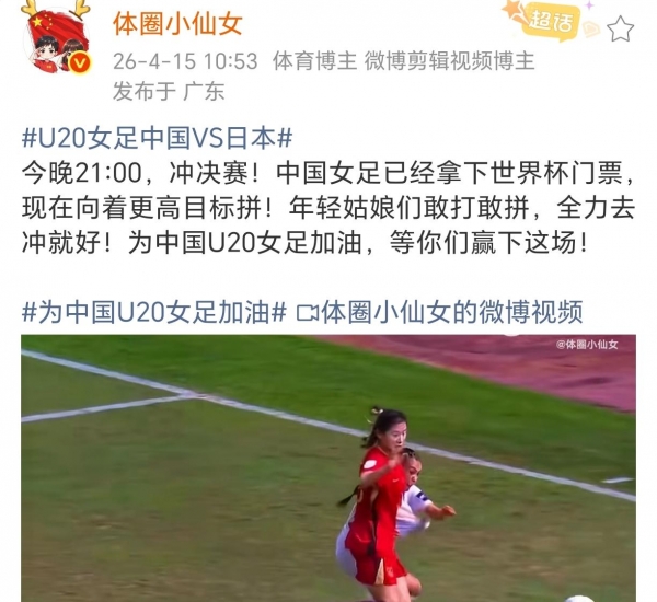 4月15日,北京时间21点00,中国U20女足将在亚洲杯半决赛对阵日本队,央视5套20点55就会提前直播。赢了,直接进决赛继续冲冠,输了,比赛就到这儿了。一场定胜负,这种比赛怎么会不揪心?