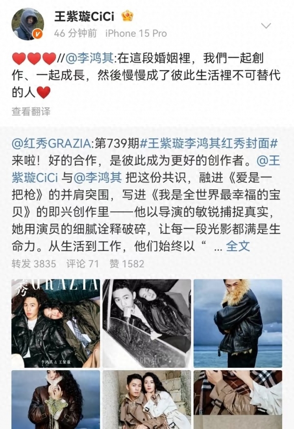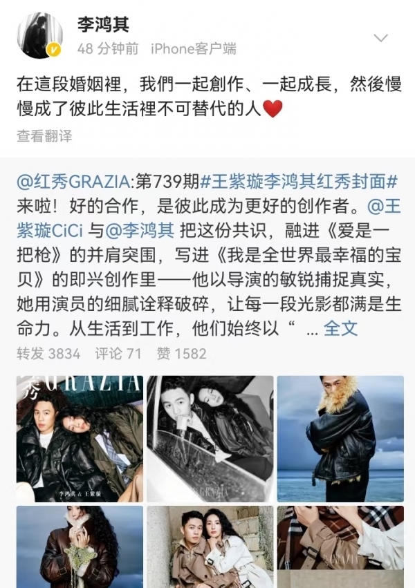 今天演员王紫璇和导演李鸿其双双发文,在社交平台官宣了结婚的好消息。