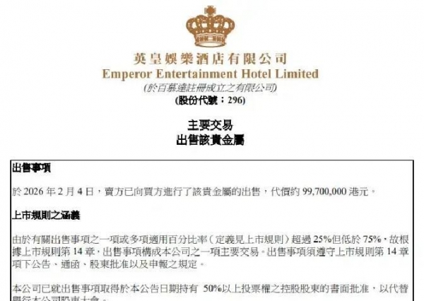 2月4日晚,酒店的母公司港股上市公司英皇娱乐酒店发布公告,清清楚楚地写着:此前镶嵌在大堂的79公斤黄金,已经全部出售!