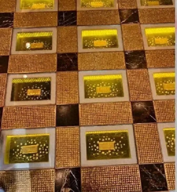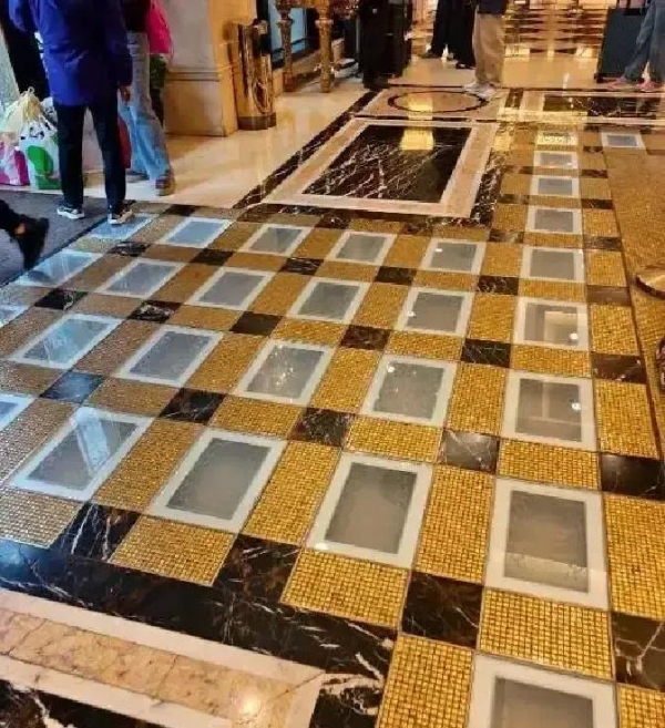 大堂地面上,78块特制的地砖下,各镶嵌着一块重达一公斤的纯金金条。灯光一照,金光灿灿,每个从上面走过的游客,都忍不住低头惊叹,感受着脚踩黄金的奢华。