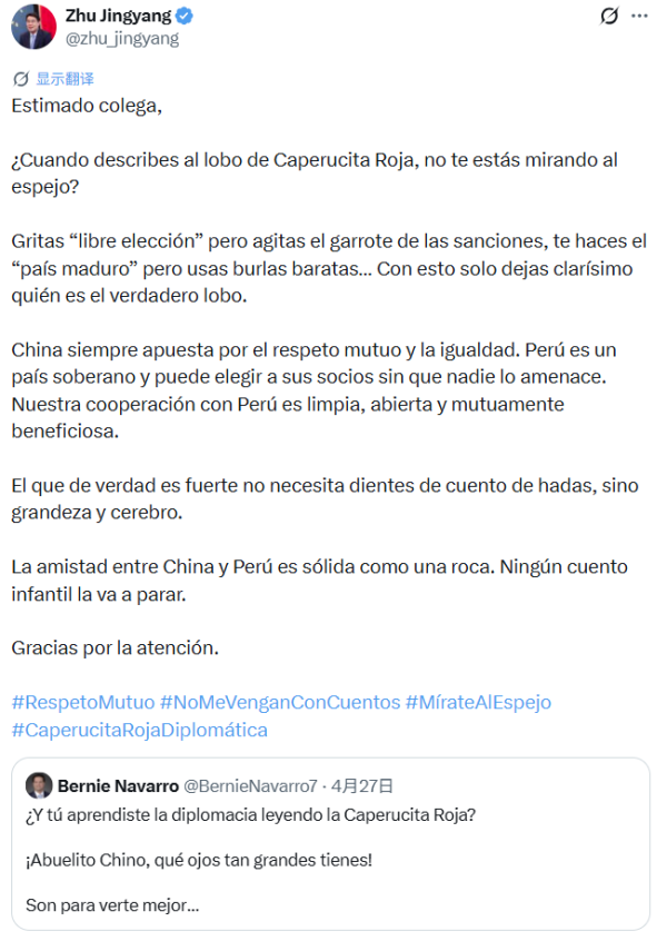 "当你在描述童话故事《小红帽》里的大灰狼时,难道不是在照镜子吗?"当地时间4月27日,中国驻哥伦比亚大使朱京阳在社交平台发文,反驳美国驻秘鲁大使纳瓦罗涉华不当言论。
