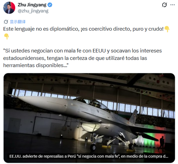 据秘鲁EXITOSA电台报道,此次网络交锋源于朱京阳批评美国对秘鲁的施压。
