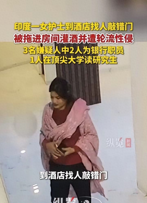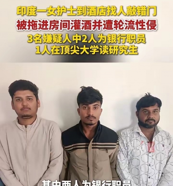 12月17日晚上,印度一名30岁的护士小薇(化名)去火车站附近的酒店找朋友借钱。朋友说住在105房间,但小薇上错楼敲了205房门。屋里三个男人其中一个是刚毕业的计算机硕士,还有两个银行职员。他们反锁房门后对她实施侵害,持续四小时。凌晨逃跑时她浑身是血,只穿内衣跑到派出所报案。
