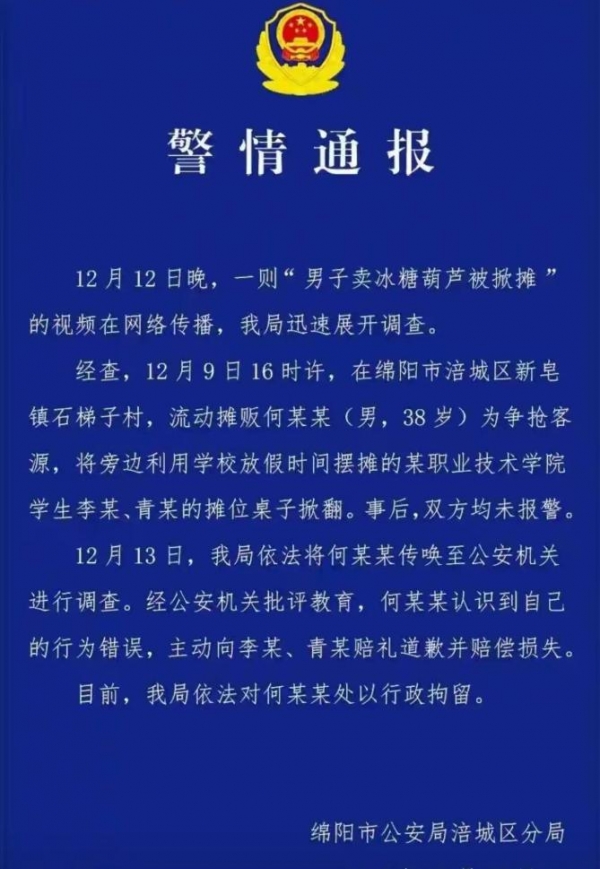 更讽刺的是何某某态度的180度大转弯。掀摊时气势汹汹,毫无愧疚。可当视频发酵,警方于12月13日依法将他传唤至公安机关后,他立刻蔫了。