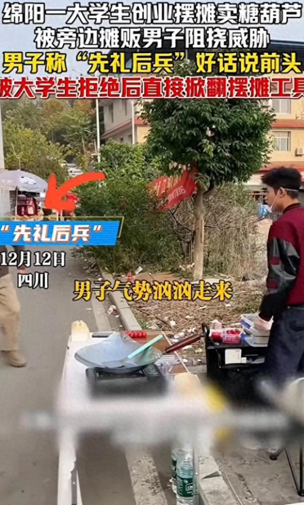 "你今天摆了就不要再摆了,我这是先礼后兵,好话给你说到前头!"四川绵阳,38岁的流动摊贩何某某对旁边摆摊的大学生李某和青某放出狠话。就在对方拒绝妥协后,何某某竟直接动手,狠狠掀翻了两位学生的冰糖葫芦摊位。这一幕发生在12月9日下午的绵阳市涪城区新皂镇石梯子村。