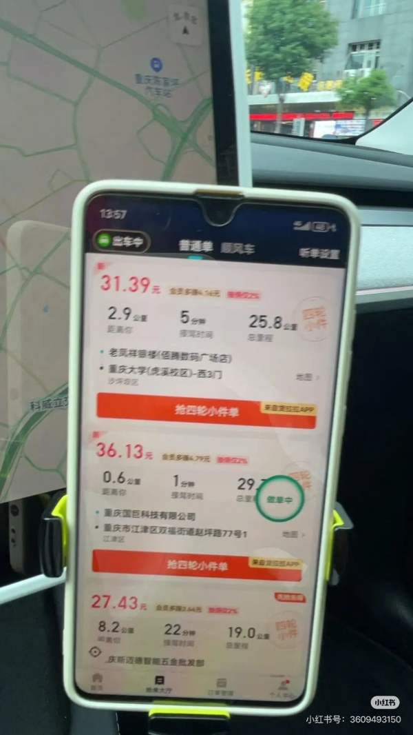 曾先生: 我刚开始跑的时候也不怎么熟悉,基本上是一单一单地跑,跑下来就不怎么划算。跑了大半个月后,我就学会拼单。现在我用两个平台,有时候会碰到一个方向有两个订单,我就同时把它接了,这样公里数的单价就高一些。比如说原来我一趟可能赚30块钱,现在我一趟能跑到60块钱。