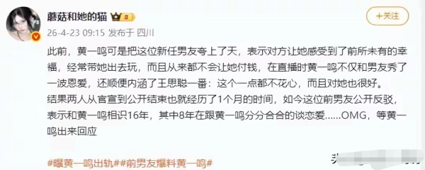 据这位前男友所说,他在和黄一鸣交往过程中,黄一鸣出轨过。黄一鸣在和王思聪交往过程中也出轨,后来还被一位60岁大叔包养。这个瓜不知道能不能保真,让人很吃惊,黄一鸣看起来这么清纯的女孩子,怎么会如此滥交呢?