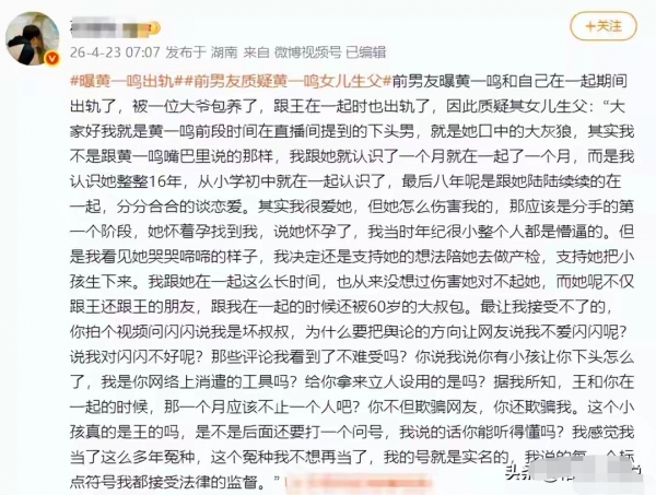 也不知道怎么回事,莫名其妙出来一位黄一鸣的前任男友,在4月22号发视频捶黄一鸣。他说自己是实名制的,说的话都可以负责。他就是黄一鸣直播间里说的那位"下头男、大灰狼"。