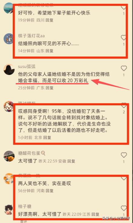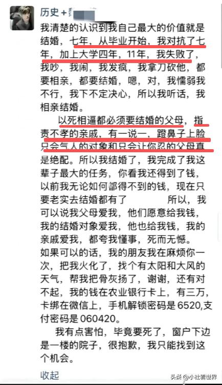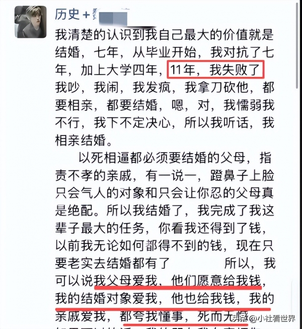 说自己从大学就被逼着结婚, 吵也吵了闹也闹了, 但在家里人眼里"你最大的价值就是赶紧嫁出去", 后来听话去相亲了, 爸妈给了钱, 亲戚夸她懂事, 好像完成任务就该"死而无憾"了。