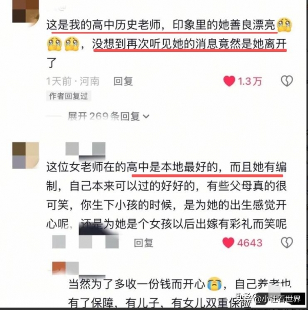 学生都挺喜欢她, 说她人温柔但有想法, 会自己掏钱给家里困难的学生买教辅, 下暴雨没带伞的学生她开车送回家。