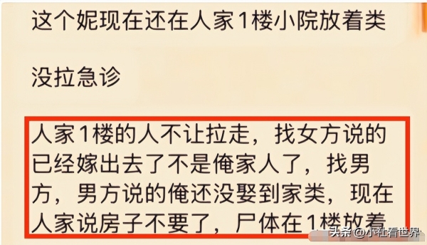 婆家说"还没正式拜堂", 也不算他们家的, 就这么推来推去, 遗体在楼下放了整整一天。