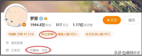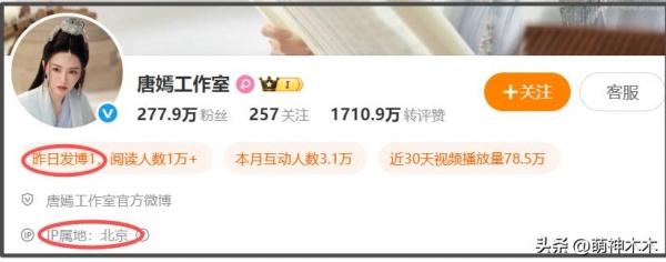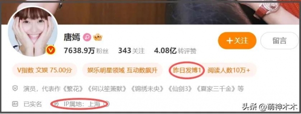 更微妙的是,按照平台IP显示规则,一旦上线更新就会定位到当下IP,唐嫣的账号IP就显示在上海,而罗晋的账号IP则显示在北京,虽然不排除有工作人员上线帮忙转发的可能,但唐嫣工作室的账号IP显示在北京呢。