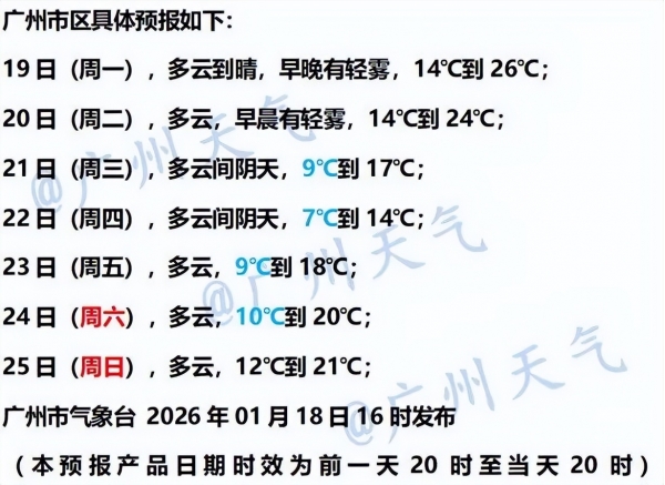 广州市气象台预计,1月19日-20日白天广州以晴朗干燥天气为主,间中云量略多,早晚有轻雾。1月20日傍晚起较强冷空气将自北向南影响广州,北风增大,气温明显下降。