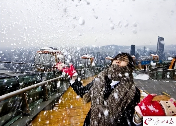 2016年的广州塔顶,天空飘落大片雪花。图:广州日报