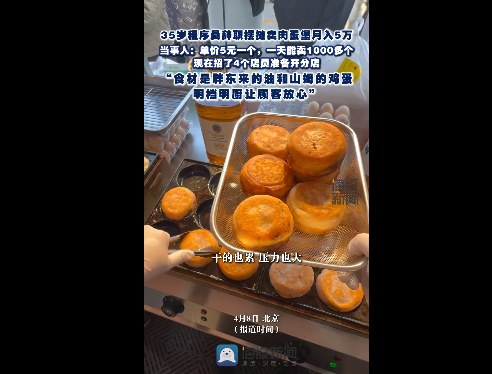 北京35岁的刘先生,前阵子还在写代码,现在已经成了肉蛋堡摊的老板。他辞职摆摊卖肉蛋堡,一个卖5块,一天能卖一千多个,一个月下来能赚5万,现在已经雇了四个店员,正准备开分店 。