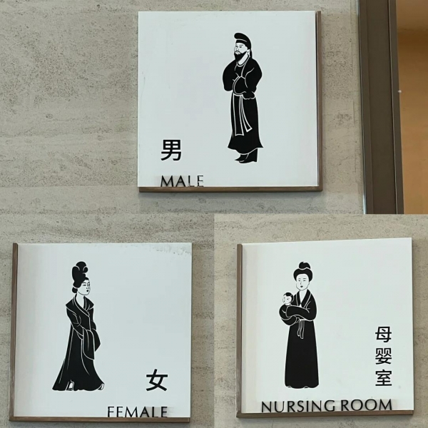 比方说,陕西某博物馆就曾化用传统文化元素,制作了非常明显的标识,男士留了大胡子,女士穿着拖地裙装,就连母婴室也很形象。