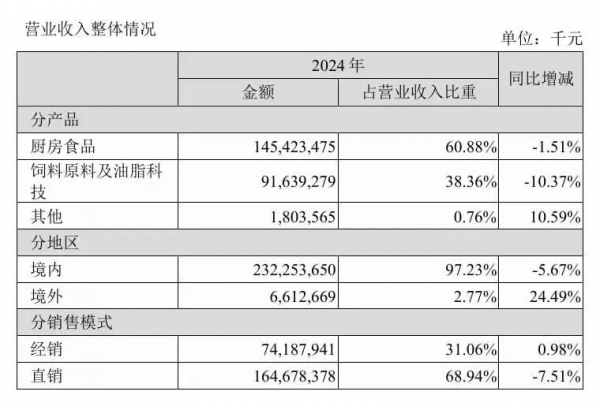 金龙鱼赚的钱几乎都来自中国,2024年差不多超过97%的收入都是中国国内市场的,无论是卖给家庭、超市,还是学校、企业、餐馆,基本都是在中国发生的。