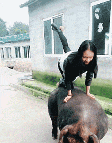 还好这头猪十分听话,不然姑娘就摔惨了