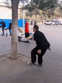 大爷的硬核健身方式,难为棵小树了。