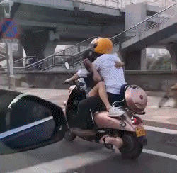 大哥,骑摩托车时可不能秀恩爱,这么做多危险啊!