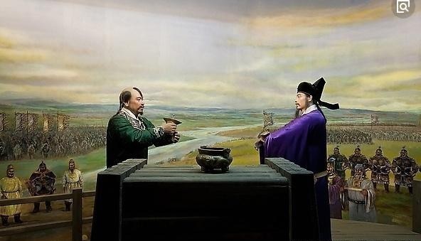 于公元1004年秋,辽国萧太后和辽圣宗大举进兵北宋,辽军的铁骑在北部平原上如入无人之境,直抵澶州,眼看着很快就能过黄河,到达北宋京都开封了。这个时候的宋真宗赵恒和朝中大臣慌了手脚,皇帝吓得要逃跑,大臣王钦若主张迁都南京,也有主张迁都成都的,独有宰相寇准主战,跟皇帝说,人家已经打到家门口了,再跑能跑到哪儿去?难道不顾祖宗留下的基业吗?皇上只要到前线走一走,战士们看到皇帝不顾危险到了前线,定能卖命厮杀。若果逃跑,咱们还没有找到安稳之处,就已经被人家的铁骑追上给斩杀了。