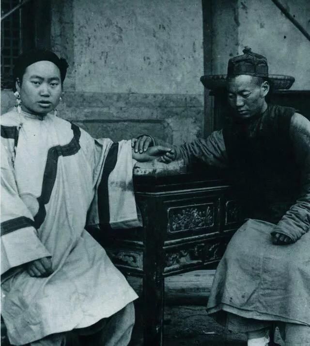 清朝农村女人罕见照片:晚清一位中医为妇女把脉诊断中医面露难色,目光投向地下,彷佛有什么难言之隐。女人也不知自己到底得了什么病,茫然不知的情况。估计心里也是七上八下,不知所措。