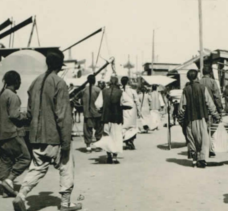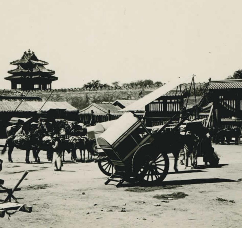 图为清朝1908年的北京街景旧照,彼时的北京市集还处于非常封建落后的状态。当时北京城里的大部分道路都是尘土飞扬,一到下雨时候就因下水不通变得泥泞不堪。