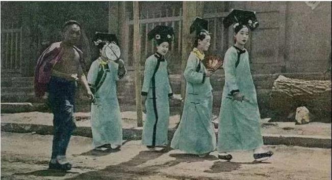 一群宫女从深宫中出来,结伴而行外出采购,这张是黑白老照片复原的彩色照片,她们一方面好奇的打量这相机,一方面又羞涩的拿扇子遮挡自己的面容。