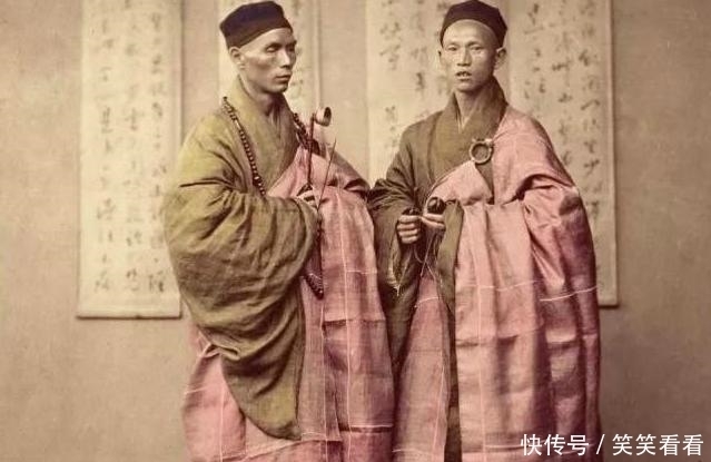 晚清上色老照片:图为两个穿着袈裟的出家人,在他们的背后有四幅字。