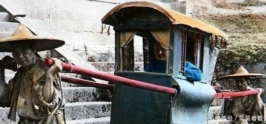 晚清上色老照片:图为两个年纪挺大的轿夫,抬着一个大户人家的夫人,轿夫穿着破烂的衣衫和坐在轿子里的夫人形成了鲜明的对比,穷人和富人的差别。