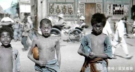 晚清上色老照片:衣不果腹的小乞丐,每人夹着一个讨饭的碗,看看他们的衣服,都露着肚子,蓬头垢面的,看着非常可怜,让人心酸。