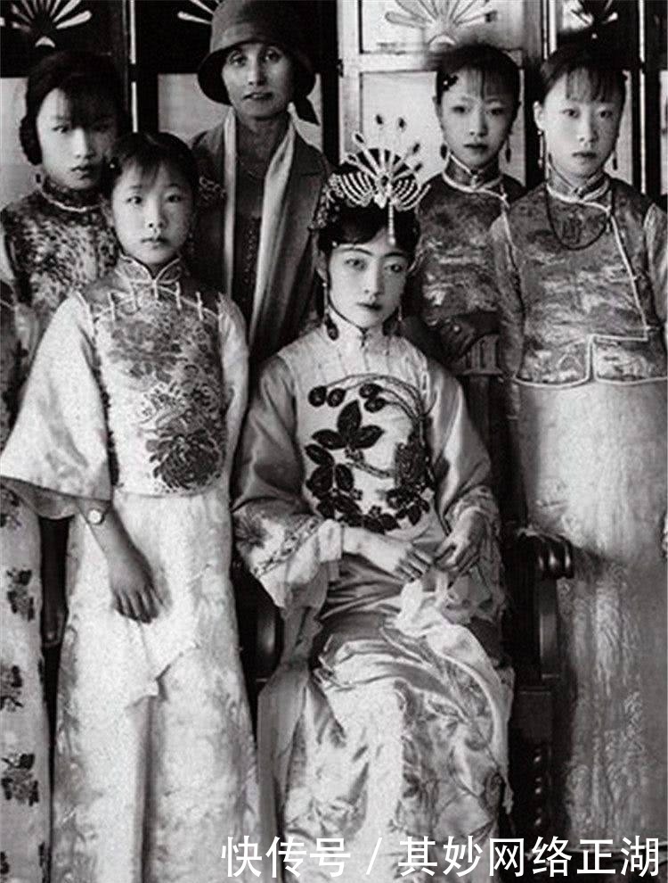 图四:末代皇后"婉容全身照。照片中的婉容端坐在正中间,风华绝代的容貌和端庄典雅的打扮,一看就是整张照片中的焦点。旁边站着的女孩中,有几位是溥仪的妹妹。尽管年纪还小,但是大清"最后的格格们"在气质上也一点不输"嫂嫂"婉容,也将皇室贵族独有的高贵气质悉数展现了出来。