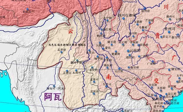 至于八百大甸军民宣慰使司(兰纳王国)、老挝军民宣慰使司(澜沧国)、底马撒、大古剌(汉达瓦底王国)、缅甸(阿瓦王朝)几大宣慰司,实际上是原来的缅甸蒲甘王朝分裂之后形成的王国,明朝只是象征性的册封一下,并未派遣一兵一卒、一官半职到这些地方。这些王国和明朝的交流很少,连朝贡贸易都几乎不存在。因而,不能算为势力范围。这些土司在永乐年间就基本停止和明朝的交流,如永乐六年之后,底马撒宣慰司贡使不至。