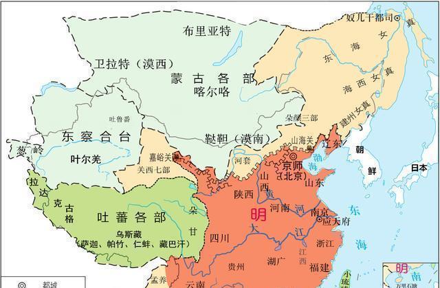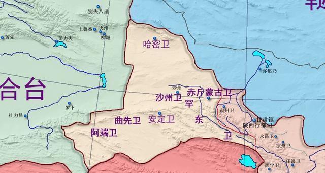 西北地区,明朝册封为关西七卫,分别是安定、阿端、曲先、罕东、沙州、赤斤蒙古、哈密七卫。这些实际上都是蒙古各部势力,虽然接受了明朝的册封,但是叛乱无常。不过在永乐年间,他们的确算是明朝势力范围,虽然明朝没有驻军,但是他们受到了明朝的控制。永乐之后,这些蒙古王公就投靠了瓦剌。