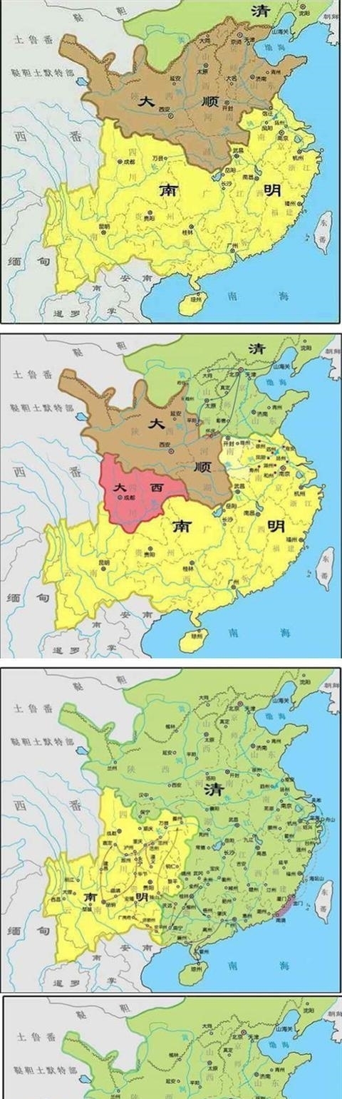 1644年,明朝被农民起义推翻。随后在内地出现了李自成的"大顺"、张献忠的"大西",南明、郑氏等割据政权、此时,皇太极已经去世,顺治继位,实权掌握在多尔衮手中。多尔衮趁机入关,在1644年击败了李自成,定都北京,宣告"兹定鼎燕京,以绥中国"。之后,清朝先后灭了大顺、大西两个农民政权,弘光、隆武、邵武、永历等南明政权,最终在1664年统一了内地。