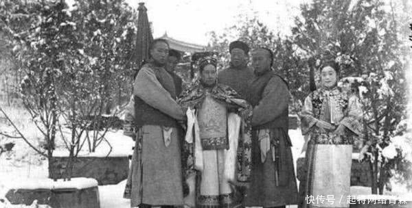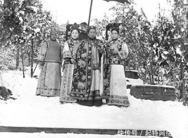 图:慈禧在冬季的雪地里留影,旁边搀扶她的两位是她的贴身侍卫。