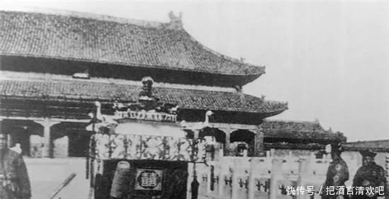 这是停在乾清宫外准备迎接婉容的花轿,这种轿子与那些清宫剧中几十人所抬的花轿差距甚大,也能看出婚礼排场大不如前。