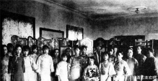 婉容与女来宾的合照,唯一坐着的婉容显示出了地位的不同。