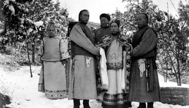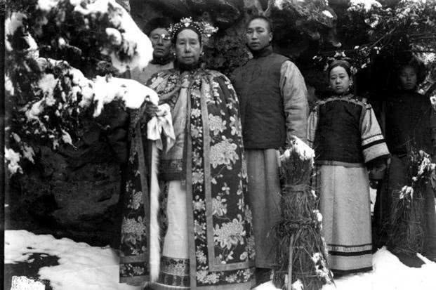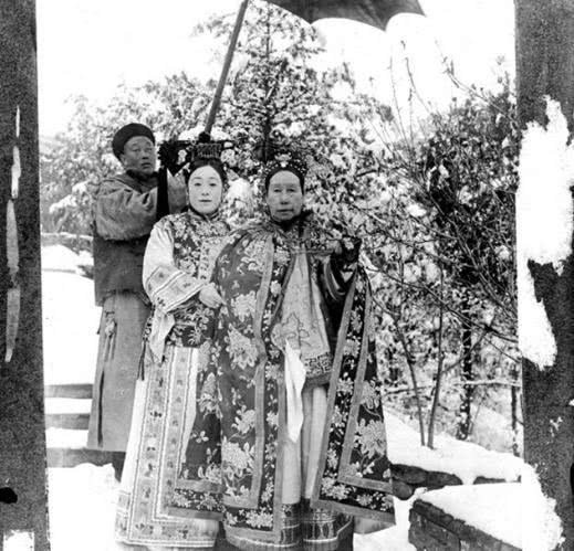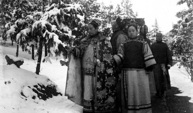 颐和园下雪了,慈禧太后欣赏雪景,身后跟着丫鬟和便装的太监,看起来,慈禧太后年龄还是蛮老了。