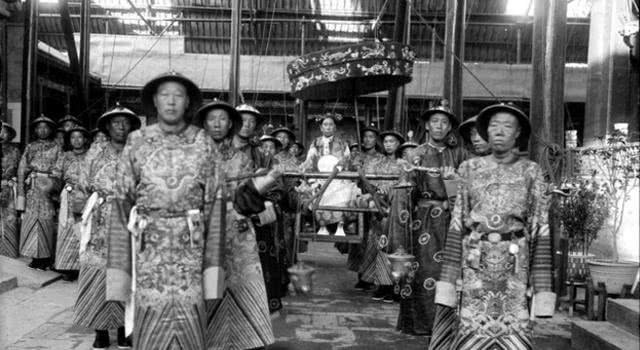 这张照片大家应该很有影像,在网络上频频看见,这是慈禧太后出行,太监们抬着八抬大轿,周围丫鬟、太监林立,颇具封建统治的风韵。